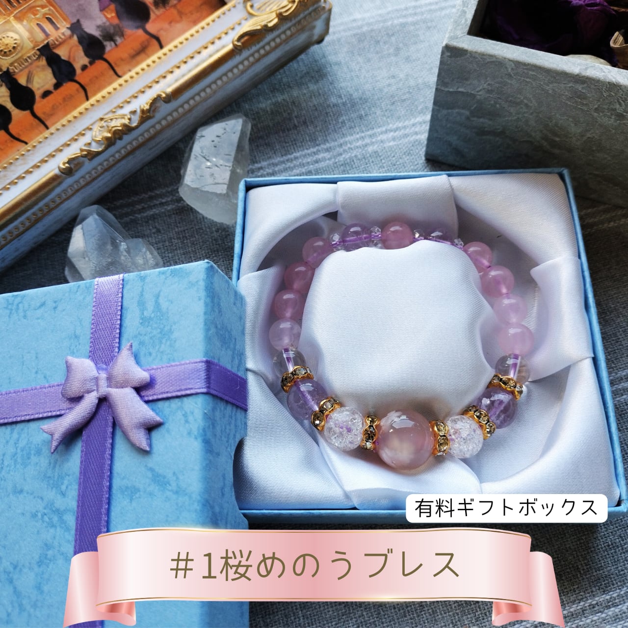 使用素材: 天然石(桜瑪瑙、ローズクォーツ、紫水晶、クラック水晶、カット水晶)、金属パーツ(ロンデル/真鍮・メッキなど)、オペロンゴム(薄紫/4重/伸縮性あり)