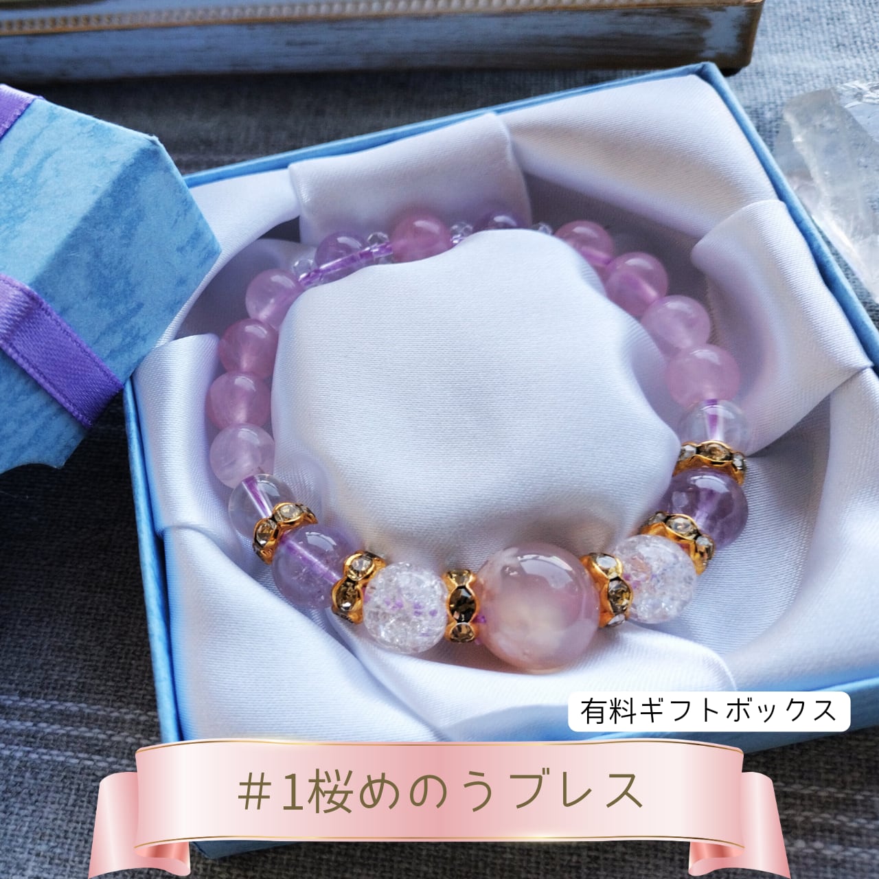 優しいピンク色の桜瑪瑙とローズクォーツ、気品ある紫水晶(アメジスト)を組み合わせ、キラキラと輝くクラック水晶とカット水晶でアクセントを加えた、美しいデザインブレスレットです。