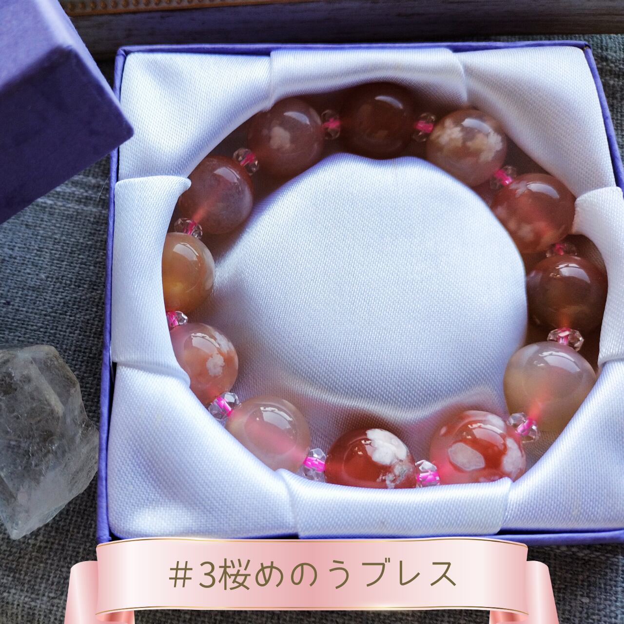 桜瑪瑙(チェリーブロッサムアゲート): 14mm大玉。癒しと優しさ、基盤を固める、運気の流れを良くする。