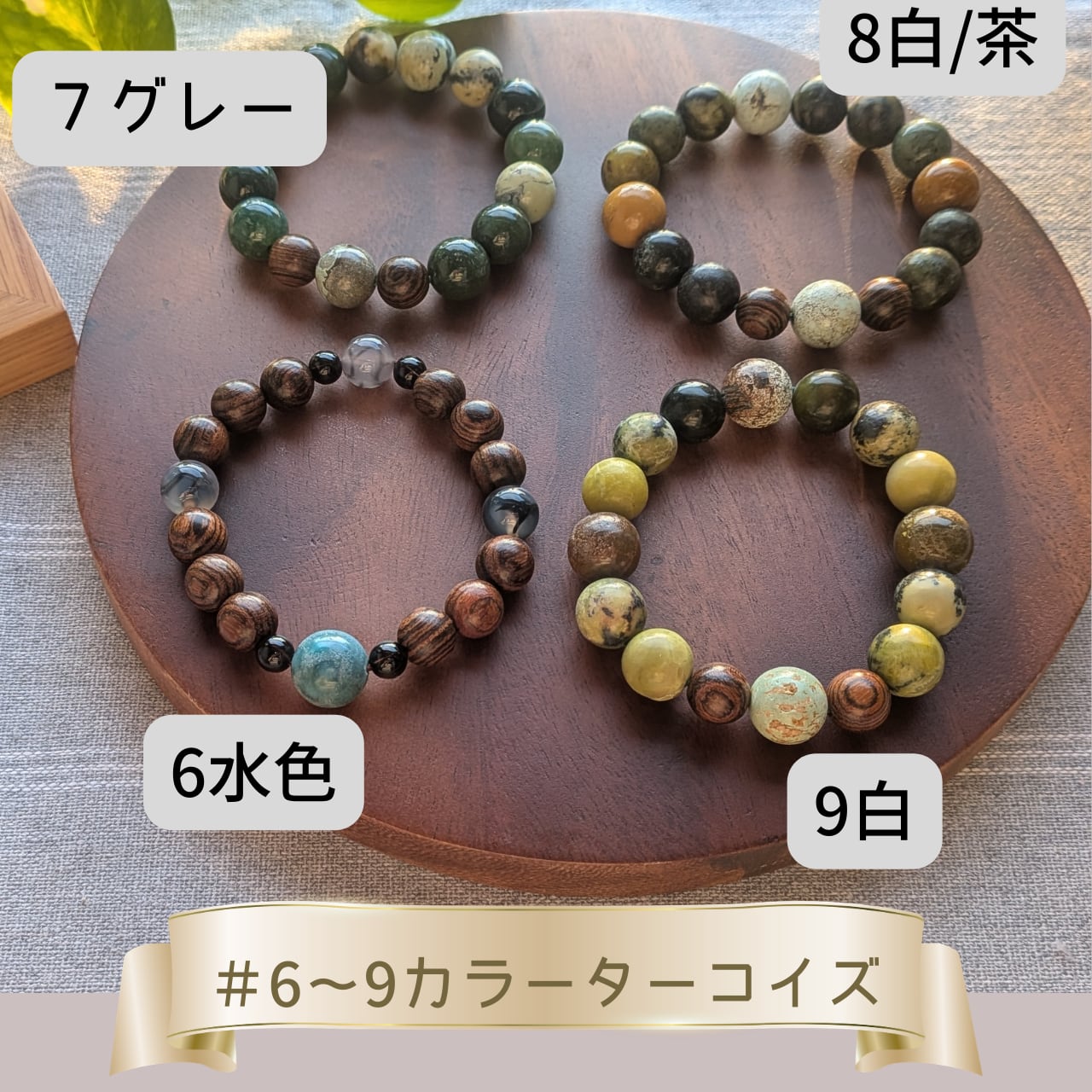 #6-9 選べるお守り|ターコイズ×虎紋檀木 天然石ブレスレット|厄除け・願望成就・旅の安全16cm